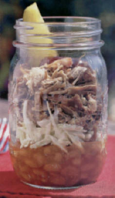 | Divide two cups warm baked beans evenly among 4 small bowls, mugs, or jars: top each with 1/2 cup coleslaw, 1/4 pound warm shredded barbecued pork, and sauce. Serve with a dill pickle wedge, if desired. |